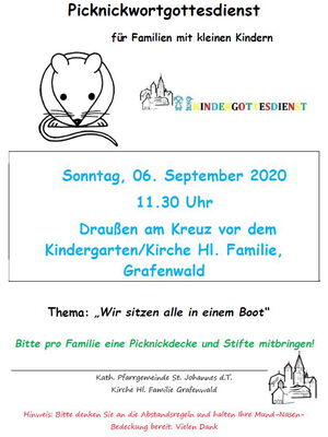 Endlich fand wieder ein Kinderwortgottesdienst statt. über 30 Familien haben am ersten Septemberwochenende an dem so genannten Pcknickgottesdienst teilgenommen. Hierbei wurde allerdings nicht im herkömmlichen Sinne gepicknickt, sondern Picknickdecken wurden als Sitzflächen für die Familien platziert, um den Abstandsregeln gerecht zu werden.