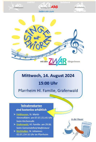 Die Caritasgruppen aus Feldhausen, Grafenwald und Kirchhellen laden gemeinsam mit der ARG Hl. Familie zum Senioren-Sommersingen ein. Nach einem erfolgreichen Auftakt im vergangenen Jahr soll es in diesem Jahr eine Neuauflage dieser Seniorenveranstaltung mit den „Zwar-Sänger:innen“ geben.