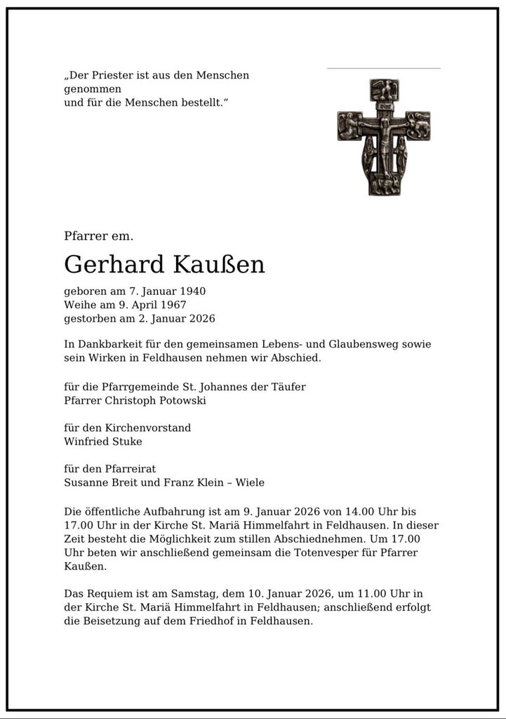 Totenvesper und Requiem für Pfarrer em. Gerd Kaußen